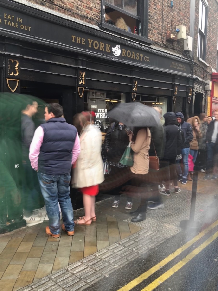 The new Harry Potter shop and the York Roast shops both had long queues outside them. The York Roast shop has become very famous for its Yorkshire pudding sandwich and has made national TV.
